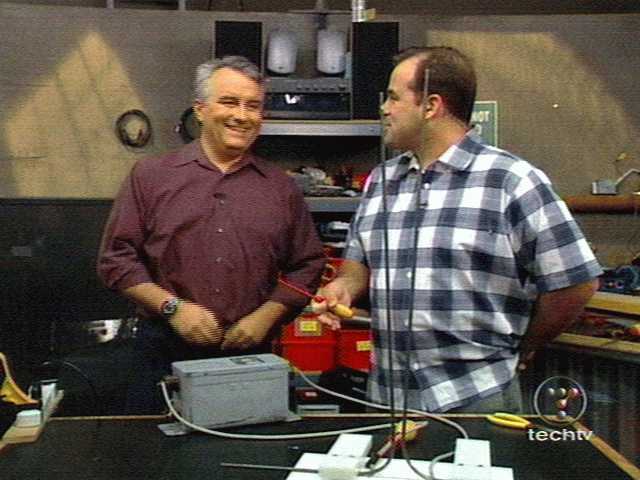 Here Leo and Patrick of the Screen Savers on TechTV are making a Jacobs ladder, If you look closely at the transformer you can see 2 brown bushings on it. This image was captured Using an AverMedia TV98 TV tuner card in my computer..................see close up [id=32272566] |