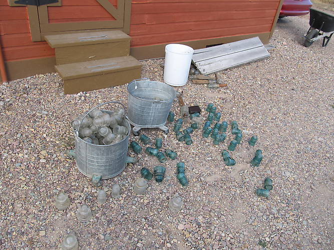 Three buckets of insulators I found at an antique store in the mountains in Montana. They mainly consisted of clear Hemingray CD 106s, clear & aqua Hemingray CD 113s, aqua AT&T CD 121s, clear Hemingray CD 122s, aqua H.G.Co. CD 145s, Hemingray-blue Hemingray CD 154s, aqua Hemingray CD 154s, clear Hemingray CD 155s and clear Hemingray CD 203s. There as a radio-treated Chance cabletop, lots of electric fence insulators, spools and screw-mounts (lag-mounts). There were also about 10 sidepins in great condition, two great wooden pins and a great metal pin. I bought a sidepin, an aqua BROOKFIELD NEW YORK CD 102 with a nice big amber streak, a hemingray blue Hemingray-9 CD 106, an aqua A.T.&T.Co. CD 121 with minor amber streaks and an ice straw MAYDWELL-16 CD 122. Amongst some other insulators (I couldn't identify) on a dark shelf, the owner also had an awesome dark purple W.F.G.co. CD 145, but she wasn't willing to part with it. Darn... |