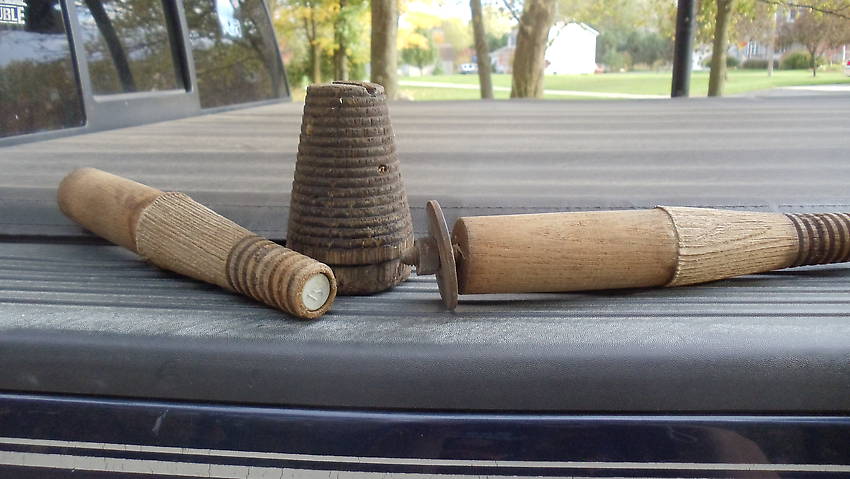 Got these from a old lineman, the 2 pins have abolt that comes out the bottom, and the top has a insert in it. He said he found 3 on a pole, they where the only ones he had seen. The other piece he got off a pole, but didn't know what it was for. It is the only one he had ever seen. |