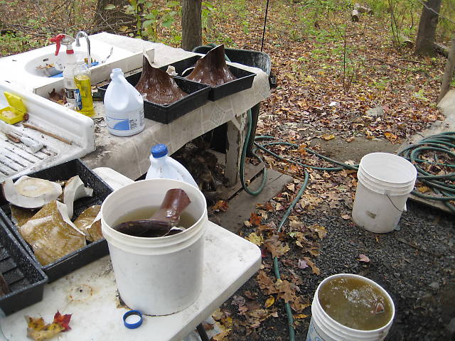 Soaking the parts in liquid bleach to detach the organic matter from 90 years of burial then initial septation of parts from each shell and insulator