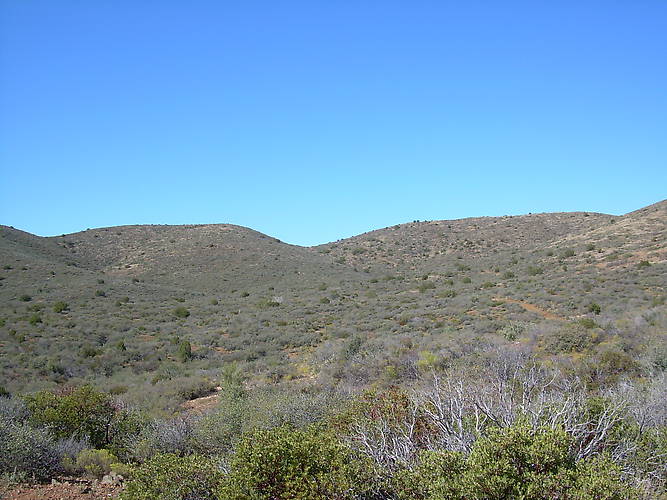looking at this picture the line crossed thru the lowest point in the mountain range towards Poland Jct. and on to Prescott. An old mining road follows close to the line and we saw hunters out in this area today. This might be why not much was found today. |