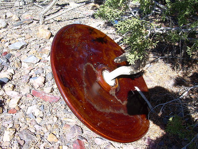Picture taken as found, Thomas 12" plate insulator. This one has a very nice light glaze with burgundy blotches.