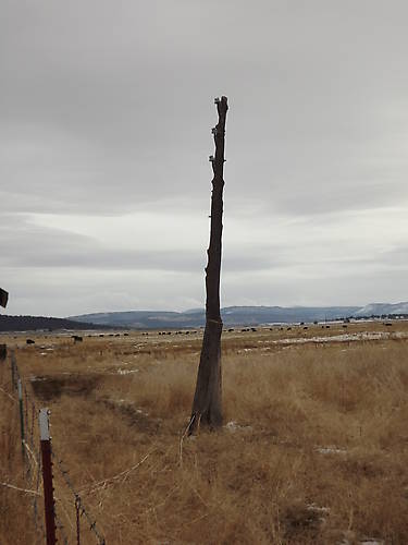Here is a shot of one of the poles. The wire is long gone. Other poles remain standing on the line with either spools or two piece doughnut type insulators. Nearby this pole is a pile of rotted cross arms with clear Pyrex tramp brackets and telephone CD 128 types. I have absolutely no idea why low voltage power insulators were used on this farmer's line but rural people are very good at making anything work and scrounging parts. The cattle don't seem to much care! |