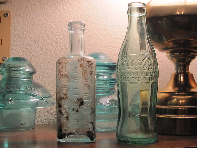 Well not exactly. Looking for insulators this is what i found. a 6 oz.PAT.D coke bottle made between 1938 and 1951 and a Dr Kings New Discovery coughs and Colds bottle dating from the late 1890`s not a lot of monetary value but pretty cool. Bottle diggers find the cool insulators. go figure. Gotta keep looking though, you never know what you will find. Note: the coke bottle has San Bernardino Ca. on the bottom |