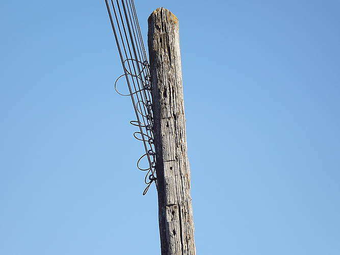 This shot shows where the gangs were cut into the pole to hold the original circuit arms. Just another shot of a pole on this circuit servicing the remaining couple ranches on this rural telephone circuit. The U-154 MLOD Pittsburg insulators were used extensively throughout Southern Oregon state on many open wire telephone circuits. |