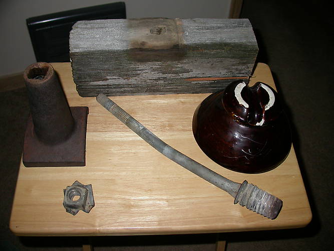 After a successful trip to this [id=327443983;pole] with a friend and a cordless circular saw, the end of the crossarm came home with me - here are all the bits and bobs once I got the nut and insulator off the pin. The pin got bent when the old pole came down, but look at the threads. Seems like the stress from decades of service really messed them up! |
