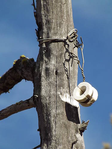 Here is another photo of one of the makeshift poles on this line. These two piece split type insulators were all marked G. P. CO. or THOMAS. There was one other marking that I have not identified as yet
