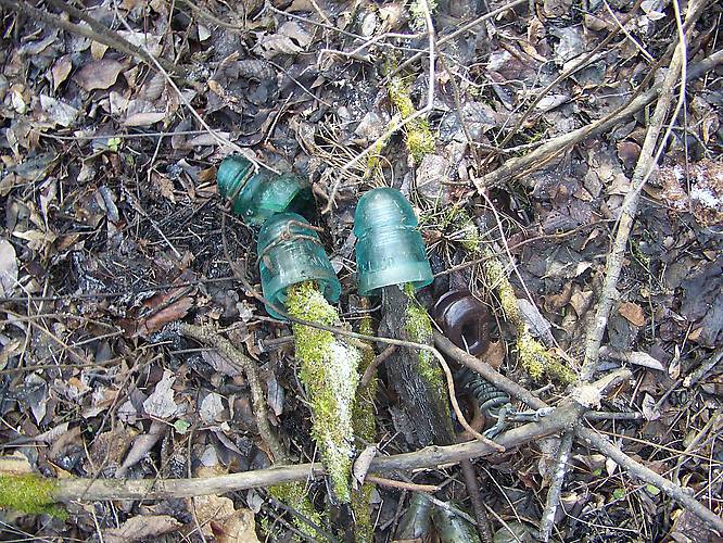 A few feet away was the good stuff... kind of. Two more GNW 145's and a busted Brookie 152. Seems almost every insulator I have found on this line has iron wires and sidepin still attached. When the poles came down, the iron wires were left on the ground. On this stretch the copper was left on the ground. There is enough copper worth salvaging, but the hawthorns have grown up through it. Still nursing a swollen hand from a few pricks. |