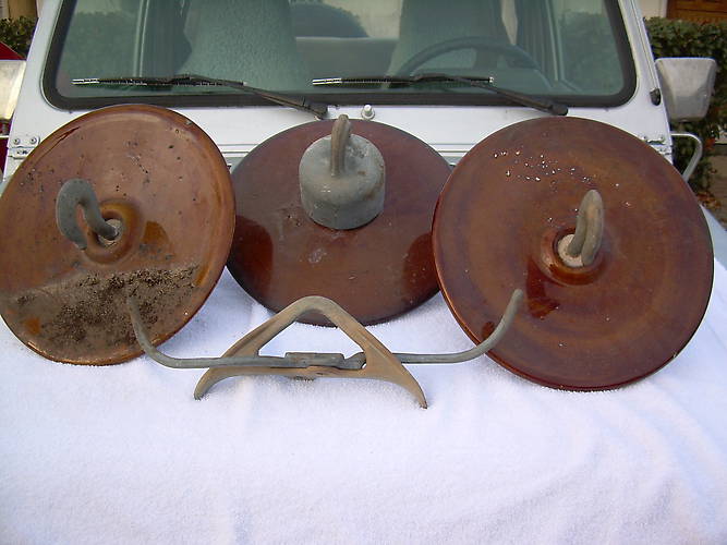 We went out today with a good friend and had a blast, Came home with three Thomas 12" plate insulators in perfect condition and with very light glaze. Two odd conductore shoes and about 20 pounds of copper.