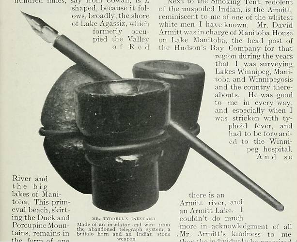 This picture is from a book published in 1910. The insulator and tie wire were acquired by Joesph Burr Tyrrell in the 1880s from an abandoned line and, along with a buffalo horn and an "Indian stone weapon", turned into an inkstand. For more about Tyrrell, see: http://www.tyrrellmuseum.com/about/the_naming_of.htm |
