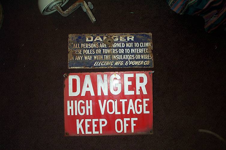 These classic signs were used on the Spartinburg- Gaston Shoals line . The blue/ white one dates from around 1907 when the line was built and has the name of the company that built the Gaston Shoals hydro plant. remarkably these old signs can be found in fairly good shape at the bases of towers as they tended to fall off when the old tie wires rusted away. |