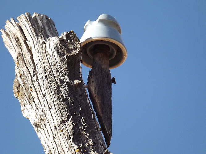 Here is a close up shot of the pole top insulator. The rancher chopped down a tree and wired it to a pole butt to make this work. The old pole (tree) is 15-18 ft in height. Ranchers and farmers had a motto "what ever works"Gotta love it!