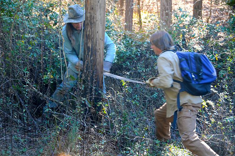 An old fashion two man saw is an ideal way to drop a pole and NOT attract attention wile doing it... we cut it in only five minutes.... (Reed Thorn photo)