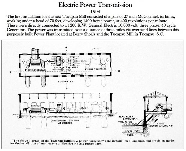This shows the floor plan, and a brief technical description of the Tucapau Berry Shoals Power House, as it was in 1904, with one generator and turbine setup in place, and the location for the planned future installation of a second generator and turbine. The water entered the turbines through the large diameter pipe in the center, and exited through the two turbines through the smaller diameter pipes, which sloped downhill, into the Tyger River. The turbines' rotation was transferred to the GE Generators through a driveshaft, which also powered some external power take-offs and leather drive belts to the ancillary lighting and power equipment inside the building. http://www.startex.org/electric_power/electric_power.htm |