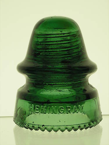 CD 162 [070] Hemingray, Yellow Green! 1/2" long "Gobber" in the front upper WGR, VNM-................drip point shelf wear and some blunting. Bruise up from the drips to the right of the front embossing (1 1/2" X 3/4"), a little roughness on the "H" "N" and "G" in "Hemingray" and a fish eye to the upper WGR in the back. These book at $400-500 in VNM, so lets go $195.00 for this one. Shipping is additional. miles_collections@yahoo.com - OR - (435) 627-8491 |