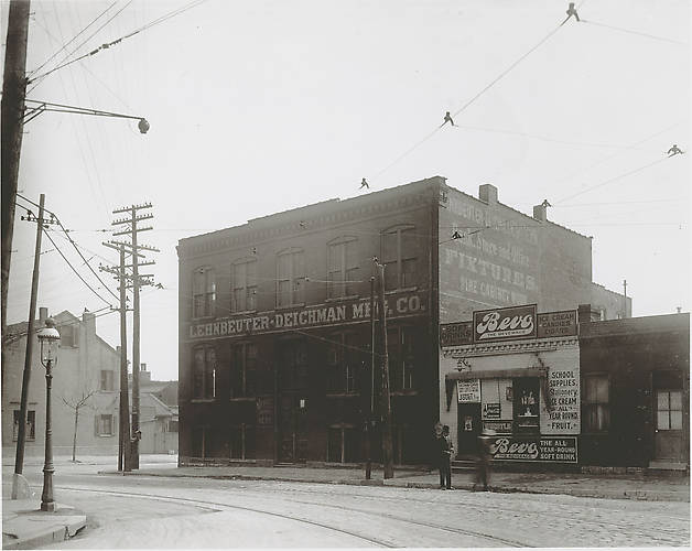 Check out the really neat Victorian-era trolley pole and its crossarm on the far left. Telephone openwire lines grace the background.