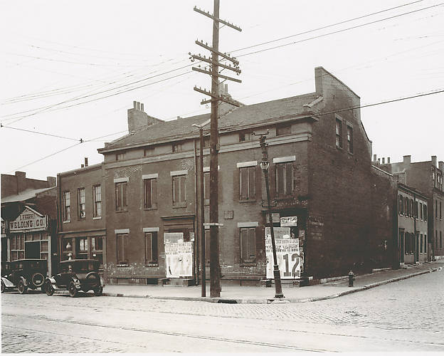 Along the center of this pole likely are electric lighting circuits. Note the very interesting three-pin crossarm brackets used to distribute service wires to customers! Telephone openwire likely is atop this pole line with fire alarm circuits on the lowest crossarm. Also note the really old metal street light pole with two insulators atop it, to the right of the wooden one. |