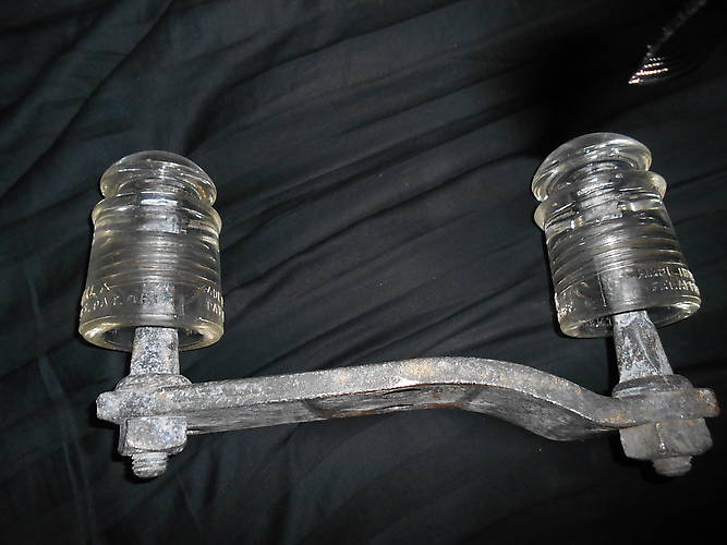 We found these Pyrex still on the pole. The pole had crashed down a hill many years ago, off the side of a railroad. we removed the insulators and later in the summer returned to retrieve the metal peg and base they were on. A great find and a nice display! |
