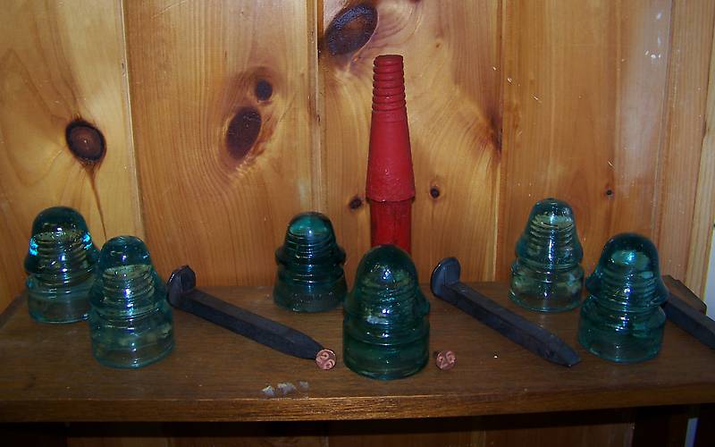 These were pulled off a fire alarm system that was installed in 1886. They sat in a barrel for decades until we went thru them. The red peg is the actual color used as was the cross arm & its bigger than the standard ones we have found on RR tracks. The spikes and date nails were also found on our hikes. Another great find on our adventures. |