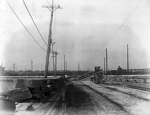 This community is adjacent to New Bedford, MA. Photo was taken somewhere near the shoreline, likely on a short bridge. This photo is an example of the early use of crossarm braces which I believe came into popular use by the late 1890s. This replaced the former method of attaching crossarms to poles simply via two lag screws, set into a "gain" or cut in the pole to "fit" the crossarm. Crossarm braces were also used with lag-type crossarm attachments until around 1910. Single through-bolts for securing crossarms also started to become popular construction by the late 1890s or so. |