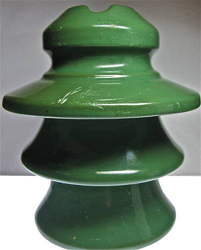 Here's a rarely offered multipart porcelain insulator with an attractive green glaze incuse marked "M BGG". This tough piece was found in Czech Republic and I believe it was made by Merklin. Glaze color matches early insulators made by Hermsdorf in Germany but incuse marking doesn't match any of their known factories. Measures 4.75" (top shell) x 4 3/8 (middle) x 4.25" (bottom) x 6" tall. Several small scuff marks and light scratches from service. Priced to fly, the first email gets this beautiful piece for only $85 plus actual postage. Thanks! |