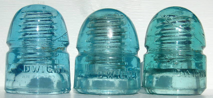 Up for sale is a great little trio of these squatty early Canadian threaded pieces. These were used along just about every Great North Western owned telegraph line in the country, not to mention some that undoubtedly weren't. Probably one of the most appealing little "common" insulators in Canada, these turn up at threadless era pole sites pretty regularly as later replacement insulators, but really you can't expect to come up to Canada and find lines just full of the things as they don't seem to turn up by the basket full - just one here or there mixed in with some other common glass. Either way, they are an interesting bunch. The piece on the left is the [010] embossing, while the other two are the [050] embossing with G.N.W. blotted out before the DWIGHT embossing. The piece on the left is somewhat bubbly, while the centre piece is just plain squatty. The piece on the right is the same embossing as the middle piece, but as you can see it is a somewhat more unusual green aqua colouration with some milky swirls throughout the glass - a colour and impurity combination that doesn't turn up too often in the realm of Dwight Patterns. The condition of all three is good. The GB example at left has a 1/8" ping on the rear upper wire ridge, the middle piece is kind of frosted and has some scuffing on the rear crown, and the green aqua piece has a 1/2" by 3/8" flake on the left side of the base, and a 1/8" ping on the right crown. This last piece displays quite well, though. I'm asking $19.00 U.S. plus shipping for the trio. I accept PayPal, money orders or bank cheques, or personal cheques from any member of ICON, or anyone I have dealt with before. Please feel free to look through my previously unsold items in the "For Sale (Not Sold)" folder, and combine purchases to save on shipping |