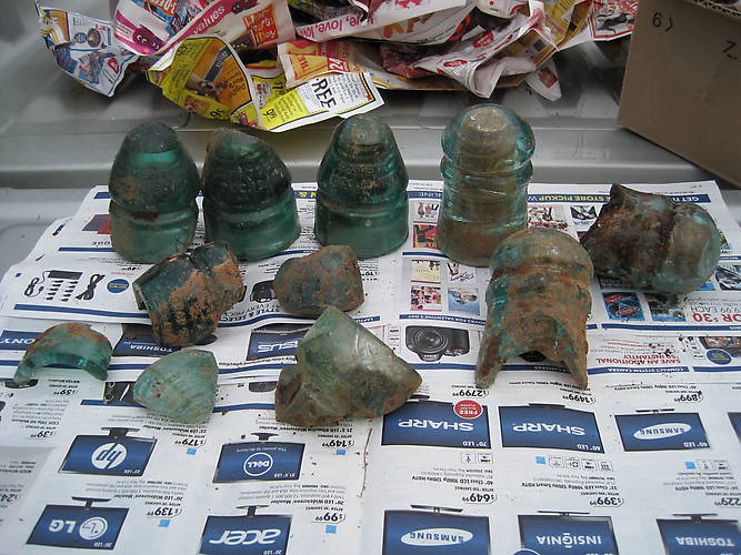 Here are all the pieces together after the dig down in Dixie. I have pieces to 5 or 6 different CD 133.4's, 3 CD 126's and pieces to 3 different CD 133 CREB's. All were found in the same place! Two of the CD 133 CREB's have nice amber streaks in them. Too bad they are broken. |