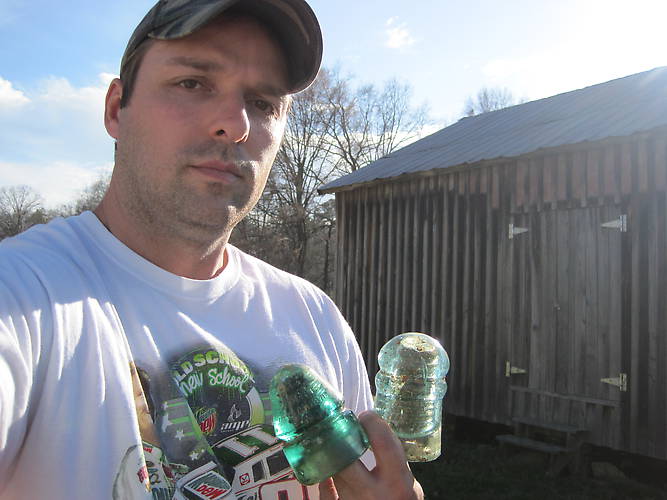 Here is a photo of me and my two best finds of the day. Behind me is a really old depot that is located along the line I was hunting.