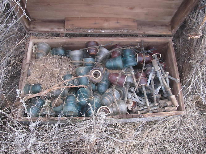 An old trunk full of glass and porcelain. More [020] H.G.CO. hives and [120] H.G.CO. 151s than you can shake a 2x4 at! Found some great porcelain signals, including the Thomas U-294A (in the help/questions section) and some others, including a COOK signal. It smelled like skunk there, so I didn't hang around this trunk too long! |