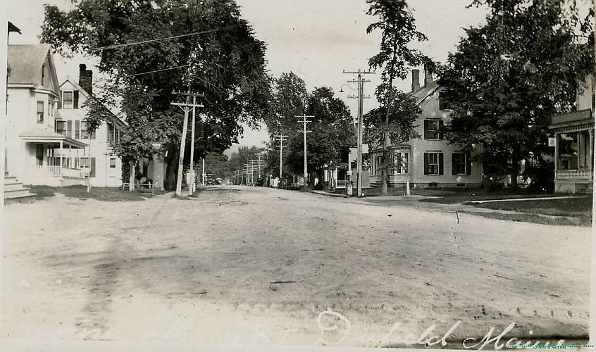 Early New England-style telephone open-wire construction is seen along the left. These 6-pin arms were among the first that Ma Bell used for local service. Many had two diagional bolt holes for pole attachment via lag screws. These crossarms also employed braces. I would estimate that this type of construction was first used by Ma Bell around 1890. This method was replaced by employing 10-pin crossarms starting around 1910, particularly during pole changeovers. These arms had a typical, single bolt hole for securing to the pole along with 28 or 30 inch braces, almost always mounted outside the crossarm. The additional pins provided extra space for adding subscriber circuits. On the right is some electrical distribution typical of the day (early teens). |