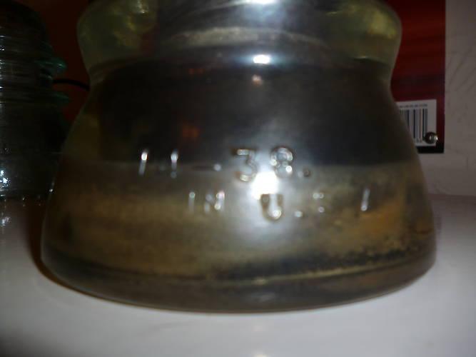 the insulator i found on the C&O RR in West Virginia has a uncommon embossing. if you look closely, the embossing has [ numbers and dots ] made in U.S.A, instead of Made in U.S.A. [ numbers and dots ]. not only that, there is a number 38 on the embossing. the first year it was ever made. |