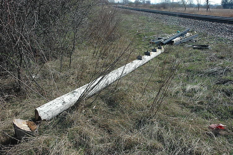So, I followed the railroad north to Bain Station Road, probably three miles or so, looking for a dumpster or any other signs of line materials. Bingo! There it was! There were cut-down poles, coiled wire, and cut crossarms. The remains were left at the pole site. Again, there were truck tracks on the more vehicle-acccessible side of the railbed. The removal "technique" consists of removing the line wire, cutting the crossarms with a chainsaw, cutting down the pole, while leaving the pole stump behind. Clearly, these guys are doing it on the cheap. All the insulators that I saw were Hemingray CD 152, CD 154, CD 155, HGCO CD 145, and a few plastic HK Porters. I glommed a half dozen CD 152s and a couple of hives just for posterity. I walked maybe a half mile of line. |