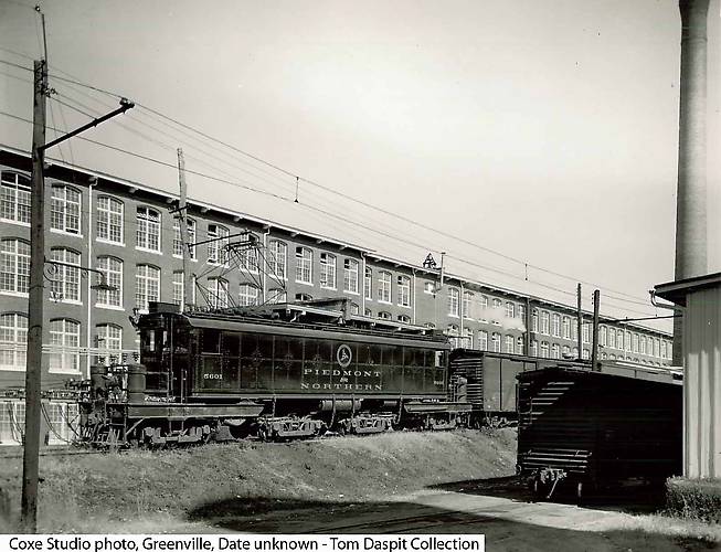 This is one of my favorite railroad photographs. It seems to have a lot of ineresting things it in. In the background, the large factory building is one of Greenville, SC's cotton mills with the chimney to the right. Most likely this is Woodside Mill or Bandon Mill judging on the size. Just below the electric engine is a substation for either the cotton mill or Piedmont & Northern Electric Railway. I see some large multiparts from a 44kV Duke (or Southern depending on the date) powerline. Above the track is the feeder lines with a large bowl-like insulator on them which is similar to a tolley clamp insulator. The other thing I like in this photo is the street light on the pole to the left. This photo is in the Daspit Collection and is from carolinarails.org. |