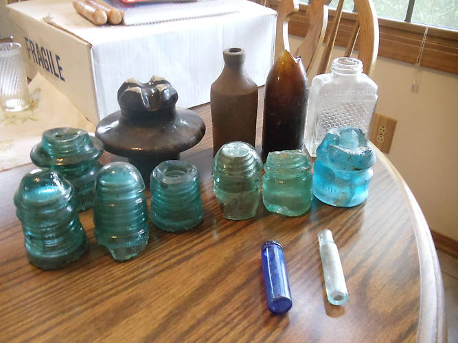 We have dug a couple times so far in a couple dumps that we have come across lately, along with a new contact. In the short time we have dug there we have found some nice pieces of good pieces, but haven't found anything whole in good condition yet. First row are 2 small bottle/ viles I found. Not sure what they are exactly. 2nd row (left-right) we have a Hemingray 12, then 2 Hemingray 11's one has a large rock in it, but is broke in half, then a CD 102.3 KCGW light green, then there is a CD 124.3 [030], next is a CD 731 S.McKEE & Co. Back row has a Hemingray 20, a nice porcelain piece, then a odd bottle only one we found there, like a porcelain type, next is a amber straight side Coke with the vertical arrows, final is a Lake Shore Honey jar. |