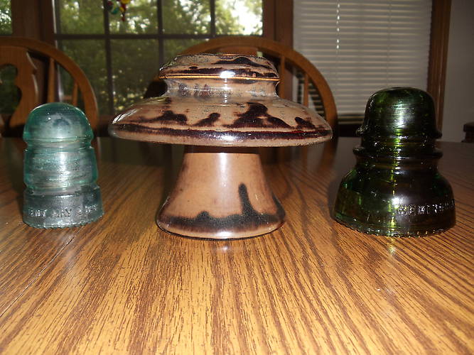 First is a Hemingray 11 found at a antique store, has a nice big bubble right above the embossing. Next is a odd porcelain 2 piece picked at a flea market. Finally is a nice Hemingray 40 in green absolutely full of brown amber swirls.