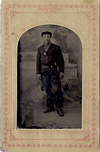 This is a posed studio tin type. Notice the ID badge pinned to his shirt.