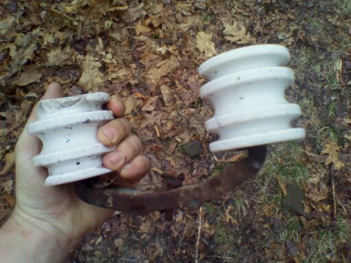 I found these last month near an open mine entrance that goes back to the 19th century not too far from where I live. I'd say these are probably from the early 20th century, they can't be much newer than the 20s, that's when the coal ran out and this mine shut down. They are threaded, but stuck on the metal spring type threads. I've never seen or head any mention of threaded procelain mine insulators that look like these ones. Anyone know if these have a U# yet? Update: These have been assigned U-92 by Elton. |
