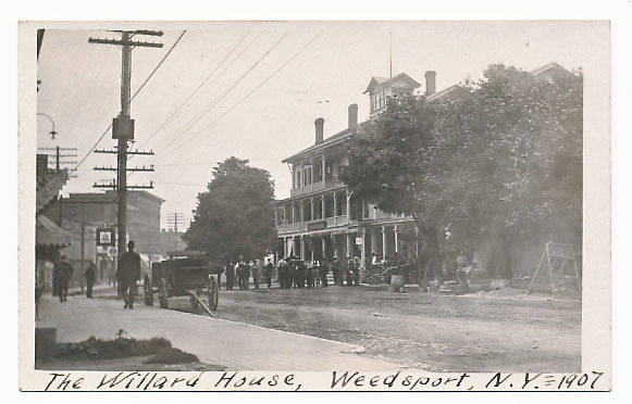 Neat early-stuff electric lighting service lines are seen here along with a wooden junction box which brought open-wire telephone subscriber circuits to paired cable. The latter could have led to this community's phone operators office. The electric lighting service lines were strung along the six-pin crossarms; lowermost as seen on the pole on the left. |
