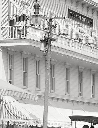 Clearly within view is an enclosed type arc light which became quite prevalent and popular around 1900 owing to its improved efficiency compared to the former enclosed-type arc lights. The latter were the first to electrically illuminate streets in the United States. Added note: On the top crossarm near the center-right you will see a small white object. This is a fuse cutout disconnect for the transformer that is mounted below. These disconnects were made of porcelain and most of them were brown. Some of the earlier ones were white glazed, like this one. A porcelain insert with a round knob-like handle was inserted into the bottom of these devices. A piece of fuse wire was mounted upon the fuseholder's pull-out "blade". The cutout's housing had the provision for two wire entiries. A lot of these had a grooved knob-like top for optional wire attachment. |