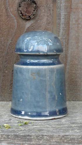 Not sure who made these. They pop up around my area from time to time. Washington Water Power used them on house drops on those groovy cast iron "J" pins. This one is close to perfect condition, with just a 1/2" rough spot/flake under the upper wire ridge. Heavy, drippy indigo blue glaze pools nicely in spots, contrasting with the lighter, more grey areas. Some pinholes in the dome filled with glaze have a bright, cobalt color. $32 + postage. |