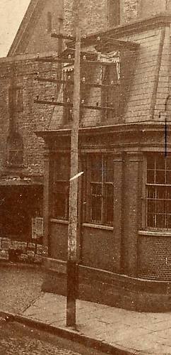 This is a closeup photo of one of the telegraph poles near one the main Post Office building in New York City at some time during the 1870s. Click "Next" for a full view of what this street scene looked like. Undoubtedly very early threaded glass insulators or threadless were used on the pole in this image. The earliest construction probably was strung along the four-pin crossarm on the top. Also, note some of the darker insulators on the lower (six-pin) crossarms beneath. Added note: a close-up examination of the original does not reveal whether any of these insulators were threaded or threadless. The latter is quite probable since the lines were used in a more tranquil enviornment (in the city) ; not opposed to exposure to open hazards along railroad routes. |