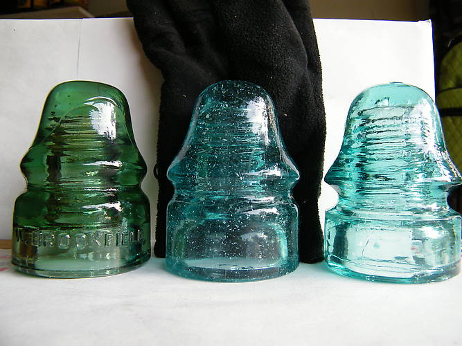 Lft. - W.BROOKFIELD CD 133 [035] flat top. Yellow Green with amber in dome/front. Mint condition Center- CD 133 [???] Brookfield Creb with lots of fine snow. Lft. - Unlisted Brookfield CD 134 Creb. Embossed Front Crown : 2/ (Arc) W.BROOKFIELD / NEW YORK Known and asked the big question to the vendor that sold me the snowy CD 133 Creb for quite a few years. Don't belive I ever purchased anything from him in the past including insulators. He finally came through with the snowy creb and the two sooty Whithall Tatum CD 154's that you'll see in another pic. |