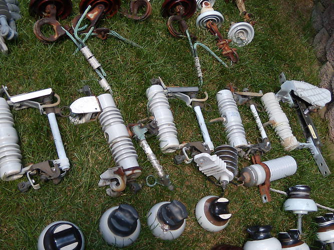Here are the cutouts and arrestors. They are (left to right) a 1980s Chance 7.8kv 100A cutout, A 1967 Line Material 7.8kv 100A cutout with an asbestos shield over the terminal, an old 100A fuse with a fiber coating, another Chance cutout, an Ohio Brass 10kv poly arrestor, An ABB cutout, a Kearny 9kv arrestor and an ABB 15kv 900A switch. |