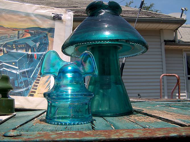 The best 2 items: Carnival glass show commemorative, and a CD 304/310 Hemingray $50 (I love it). The Green U-318 is to the left.