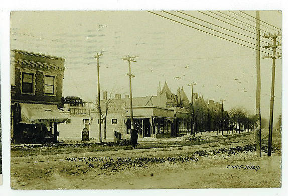 These heavy-duty poles and cables (on the right) were photographed along Wentworth Avenue south of 73rd. Physically stocky and thick copper trolley cables were traditionally necessary since they carried direct current; typically at 600 volts for trolley and street car service here in the USA. Likely local electric service was provided along the "more lighter-construction" pole lines along on the left. |