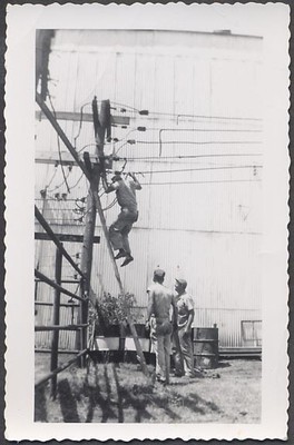 These lines were for servicing electricity customers in the immediate vicinity. Location not known but the footloose guy on the ladder certainly would have appreciated the use of one of today's bucket trucks!