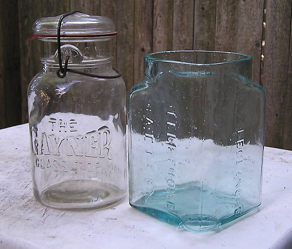 Here's a couple of go-withs I came home with today. The battery Jar is embossed TELEPHONE BATTERY on one side, PILE LECLANCHE on the other and PAT MAY 23RD 1882 on the bottom. This jar has a molded indentation on the bottom of one corner as you can see in the photo. Probably for the jar to sit on a special base or holder so it couldn't move around. The Gayner canning jar has embossed MFD BY GAYNER GLASS WORKS SALEM, N.J. on the other side. Wondering if the canning jar is common, first one I've ever seen. Thanks for looking. |