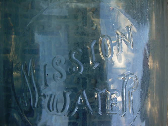 I found this bottle today in Cottonwood AZ. of all places, A very early cork closure top in cornflower blue. The bottom has the McL but I can not make out the date code? The bottle reads Mission Water in very ornate lettering and I DO NOT see this bottle listed in the McLAUGHLIN book? This is a close up of front. |