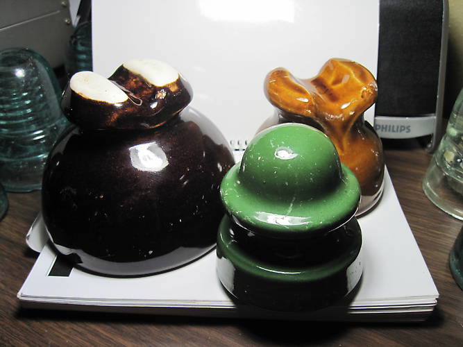 Got these up in NE Iowa. I know almost nothing about porcelain in general. The big one on the left has "May 23 1915" stamped into the top of the ear. The orangish-yellow cable has "K5" stamped in the wire groove and the green signal is unembossed. Any info on these pieces would be helpful! |