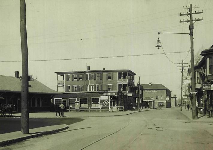 I believe the Edison Electric Illuminating Company of Boston was the electric utility at this location (a suburb a few miles north of Boston). This company operated in numerous other Boston area communities and became the Boston Edision Company in 1938. Shown is typical electric line construction of the 1920's. An enclosed-type arc light on a mast arm also is seen. The white-painted crossarms atop the pole on the right most likely were fire alarm circuits. It was commonplace for Fire Departments in Massachusetts (and likely elsewhere) to paint their crossarms either red or white. Many had "Fire Alarm" stenciled onto them for identification. This poletop practice was pretty much changed to lower locations on utility poles, so this must be a later example. |